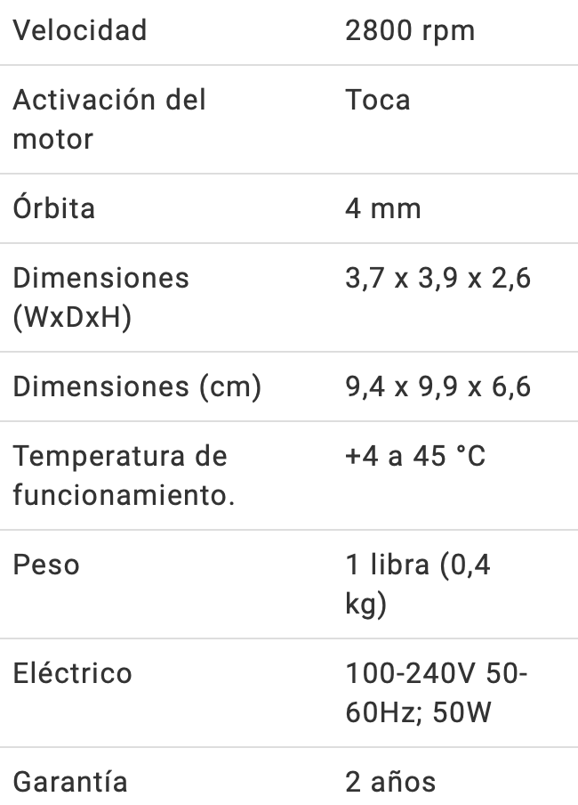 Potente es la mejor palabra para describir este mini vórtice. Con una órbita de 4 mm y una velocidad fija de 2800 rpm, el Vornado vórticea instantáneamente incluso las muestras más grandes, incluidos tubos casi llenos de 50 ml. A pesar de su potente motor, el Vornado tiene una huella de menos de 4×4 pulgadas, lo que le permite caber incluso en el banco más concurrido.