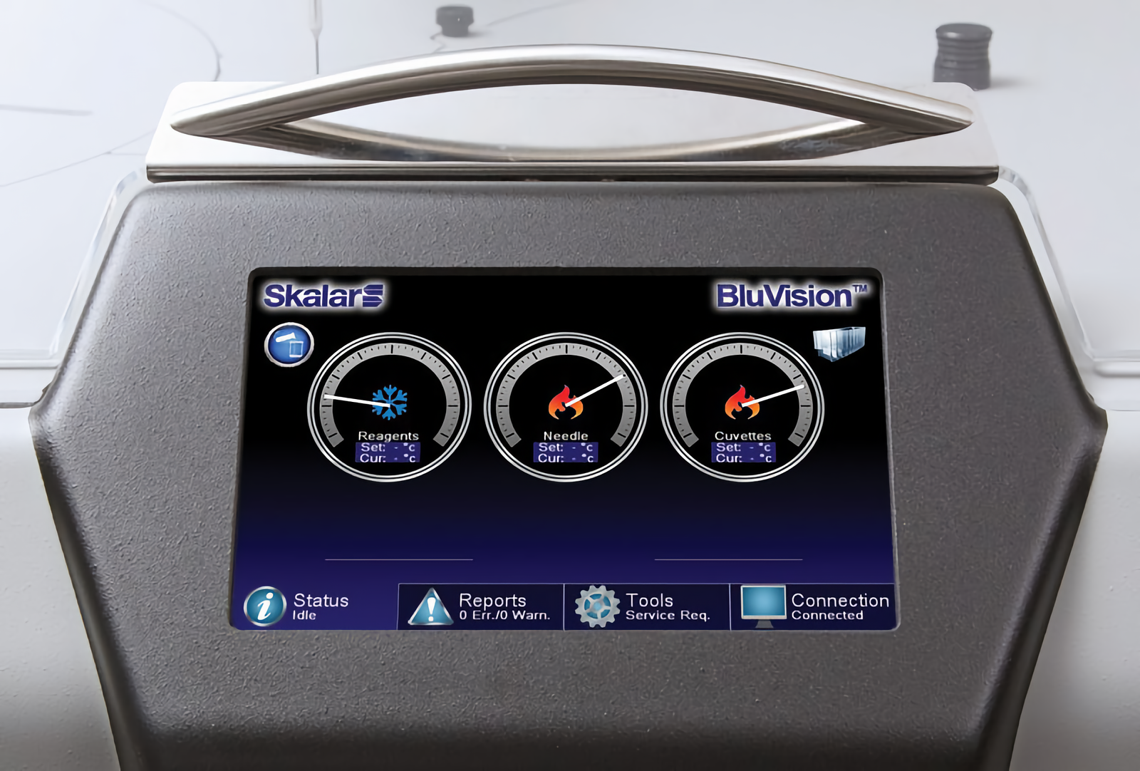 El analizador discreto BluVision™ está totalmente controlado por computador. El instrumento tiene una pantalla táctil integrada, que muestra toda la información relevante del instrumento, por ejemplo, del estado del analizador, las temperaturas de las bandejas y cubetas de muestreo. Además, una serie de comandos se pueden ejecutar desde esta pantalla, tales como la carga del bloque de las cubetas, el cambio de filtros, etc. Para correr el análisis, recopilar y calcular los resultados, el analizador utiliza un paquete de software comprensivo, el DiscreteAccessTM, que cumple con todos los requisitos actuales de laboratorio. Una interface de usuario fácil de usar permite al operador poner en marcha el analizador en cuestión de segundos. Cada corrida de análisis puede ser configurada por lotes o aleatorio. Para cada muestra, el usuario escribe la identificación de la muestra o los baja del LIMS, luego, selecciona los parámetros analíticos deseados para ser analizados e inicia el analizador.